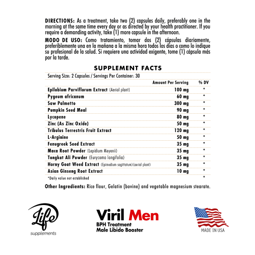 VIRIL MEN MALE LIBIDO BOOSTER, con su fórmula magistral combina varios ingredientes naturales y su eficacia se encuentra comprobada con varios estudios realizados por especialistas.